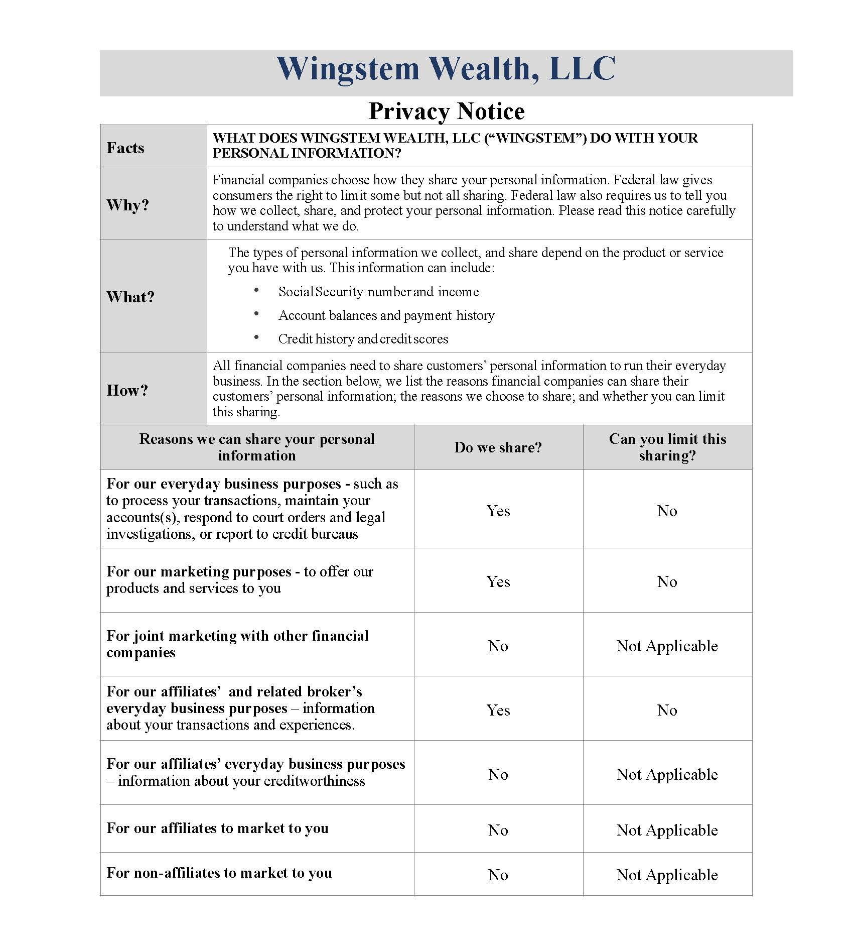 Securities are offered by Registered Representatives through Private Client Services, Member FINRA/SIPC. Advisory products and services are offered by Investment Advisory Representatives through Wingstem Wealth, LLC a Registered Investment Advisor. Private Client Services and Wingstem Wealth, LLC are unaffiliated entities.